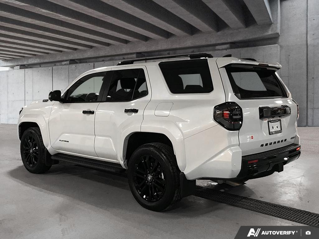 Discover premium capability, advanced hybrid performance, and refined comfort with this 2025 Toyota 4Runner Hybrid Platinum, now available at West Edmonton Mall Toyota in Edmonton, Alberta. With only 7,345 kilometers, this like-new 4Runner Hybrid Platinum offers Toyota’s legendary durability paired with the most powerful and efficient powertrain ever offered in a 4Runner, making it an exceptional choice for drivers who want rugged versatility without sacrificing on-road refinement. The 2025 Toyota 4Runner Hybrid Platinum features the advanced i-FORCE MAX hybrid powertrain, which combines a turbocharged 2.4-liter four-cylinder engine with an electric motor to deliver impressive 326 horsepower and 465 lb-ft of torque. This powerful yet efficient setup provides confident acceleration, strong torque for towing, and improved fuel economy compared to traditional V6 engines, all while being paired with a smooth-shifting eight-speed automatic transmission and full-time four-wheel drive for all-season traction and control. Built to excel both on the road and off the beaten path, the 2025 4Runner Hybrid Platinum blends rugged capability with upscale features. The exterior is distinguished by bold styling and 20-inch platinum-exclusive alloy wheels, while the interior offers a spacious, premium cabin appointed with heated and ventilated seats, semi-aniline leather upholstery, dual-zone automatic climate control, and a heated steering wheel. A head-up display and a fully digital gauge cluster bring a modern driving experience, and thoughtful touches like a power-operated liftgate and adaptive variable suspension enhance convenience and comfort. Stay connected and entertained with Toyota’s latest multimedia system, featuring a large touchscreen display with wireless Apple CarPlay and Android Auto compatibility, wireless charging, multiple USB-C ports, and an available premium JBL audio system for immersive sound. Safety is front and centre with Toyota Safety Sense 3.0, which includes advanced driver-assist technologies designed to help keep you and your passengers protected on every journey. With just 7,345 kilometers, this 2025 Toyota 4Runner Hybrid Platinum offers exceptional value for anyone seeking a nearly new, luxurious, and capable SUV for sale in Edmonton, Alberta. Whether you’re heading out for off-road adventure, towing gear for the weekend, or cruising through the city with family, this 4Runner Hybrid Platinum delivers the versatility and premium experience Toyota drivers expect. Visit West Edmonton Mall Toyota today to see this 2025 Toyota 4Runner Hybrid Platinum up close and take it for a test drive.